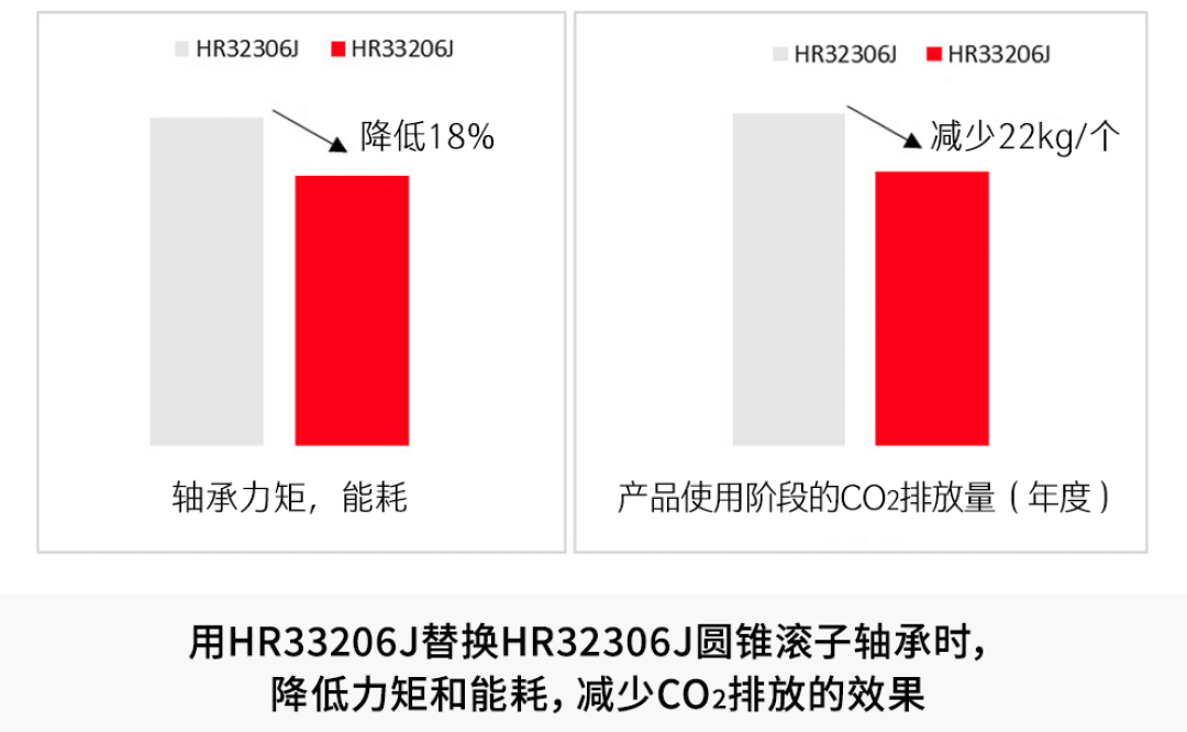 例:圓錐滾子軸承HR32306J可用較小的HR33206J代替。據(jù)估計,更換后軸承力矩和能耗可降低約18%,在產(chǎn)品使用階段每年可節(jié)約電能*4 約48kWh,相當于減少CO2排放量*4 約22kg。